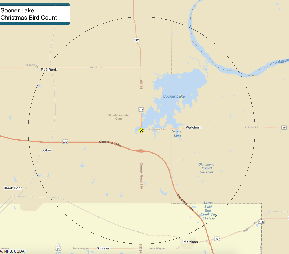 Each year, Christmas Bird Counts are scheduled on a specific day, generally between ~15 Dec and 5 Jan. Traditionally, the PCAS has scheduled the Stillwater CBC before Christmas Day and the John Couch Sooner Lake CBC sometime after. We only include birds observed on the specific day of the Count.