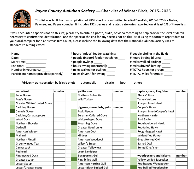 *For 2025, the Compiler for the Payne County Audubon Society Christmas Bird Counts is Tim O’Connell, tim.oconnell@okstate.edu.