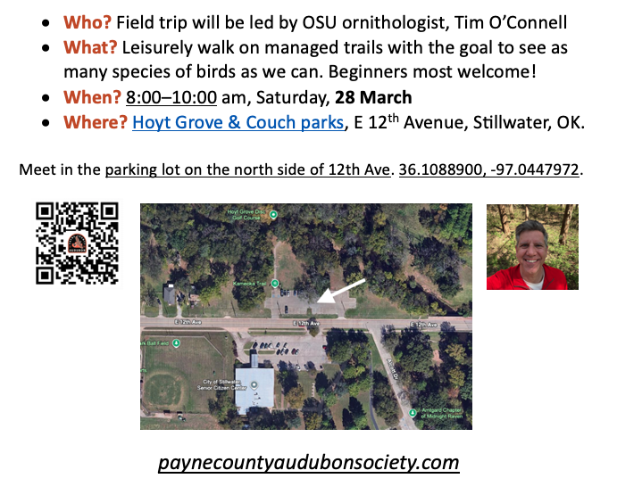 Payne County Audubon Society sponsors regular field trips and evening educational programs, a birding competition, a photo contest, and we even award annual research grants. Check out our Facebook group for a great place to share information, photos, and announcements relevant to birding and wildlife conservation right here in central Oklahoma.