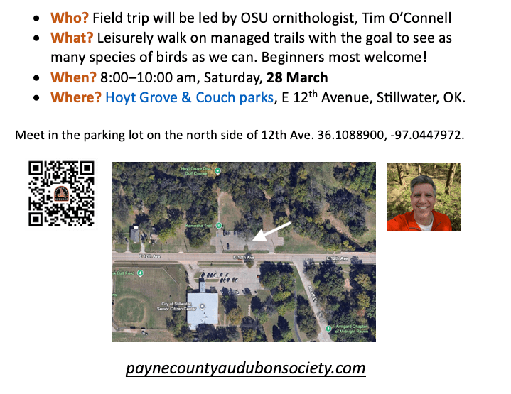 The focus of the walk will be American Woodcocks and several species of owl. Registration required. RSVP Landon Neumann at landon.neumann10@okstate.edu for more information.